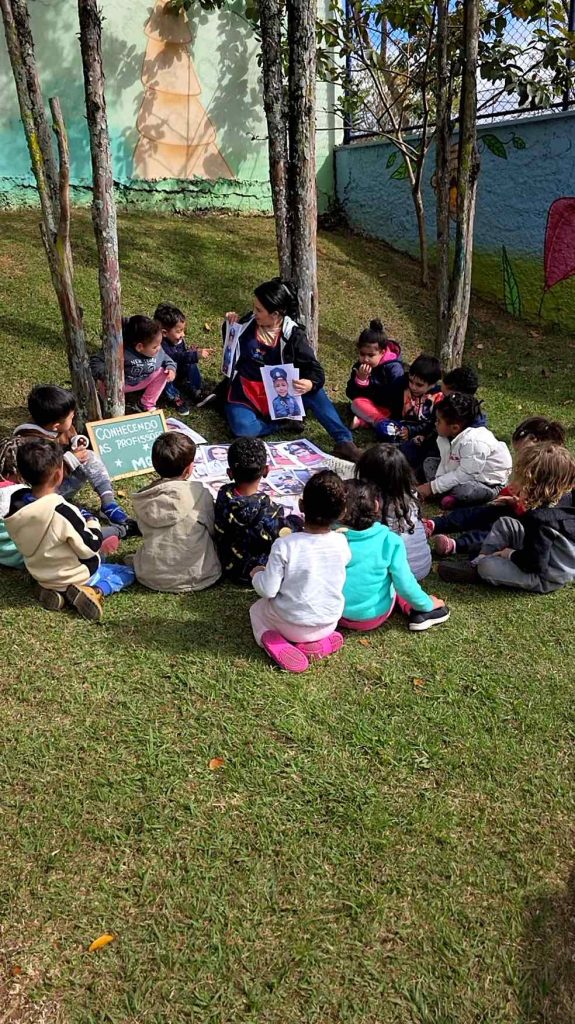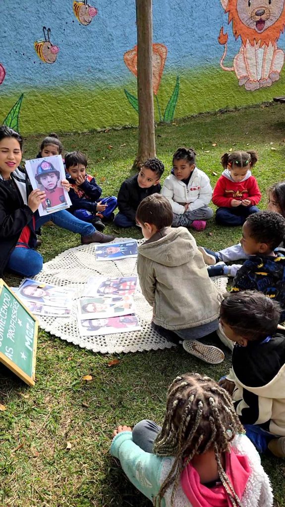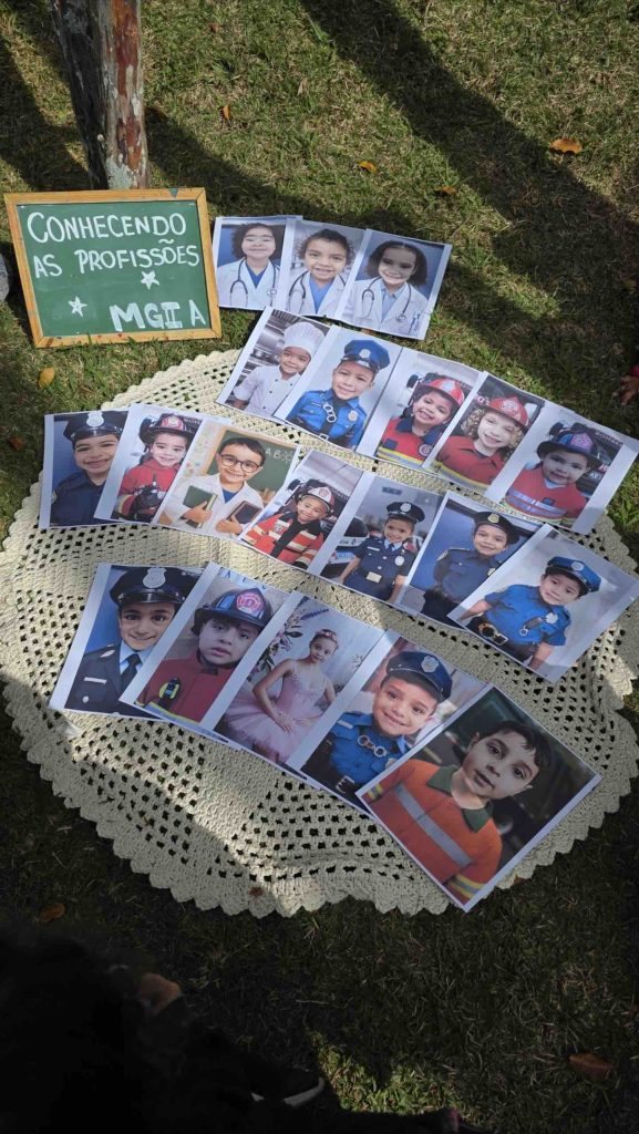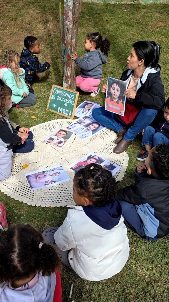 Em uma roda de conversa especial, as crianças se viram em fotos representando suas profissões preferidas: médicos, bombeiros, policiais, professores, coletores de lixo, cozinheiros, bailarinas e muitas outras. Cada imagem despertou orgulho, alegria e identificação.